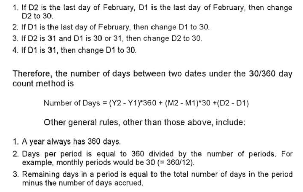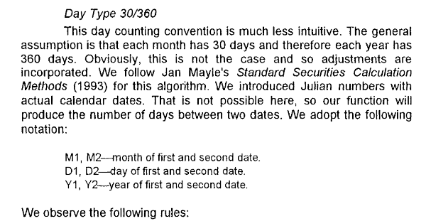 30/360 天数计算法3Source for 30/360 day-count method formula Lynch, John J., Jr., and Jan H. Mayle.Standard Securities Calculation Methods. New York: Securities Industry Association, 1986