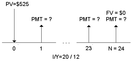如果要贷款购买价格为$525 的新桌椅,贷款期为两年,年利率为20%,按月