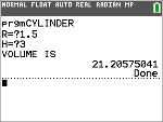 Le texte VOLUME EST, la valeur de V et Fait s'affichent. Le volume du cylindre s'affiche à 8 décimales près