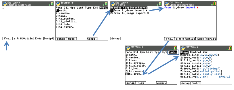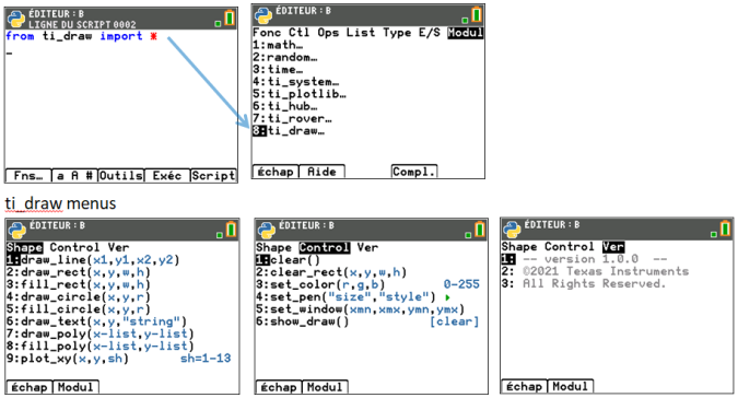 Le module ti_draw est inclus dans le dernier bundle CE. Utilisez [Fns…]> Modul [Compl.] pour coller l'instruction d’importation dans votre script. Le menu ti_draw s'affiche alors dans le menu [Fns…] > Modul comme indiqué ici.