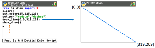 Lors de l'importation de ti_draw, la taille est "mince", "moyenne" ou "épaisse" et le style est "continu", "pointillés" ou "tirets". S'ils ne sont pas spécifiés, les arguments par défaut sont "mince" et "continu". L'assistant d'argument > permet de remplir correctement les chaînes d'arguments.