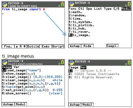 Le module ti_image est inclus dans le dernier bundle CE. Utilisez [Fns…]> Modul [Compl.] pour coller l'instruction d’importation dans votre script. Le menu ti_image s'affiche alors dans le menu [Fns…] > Modul comme indiqué ici.