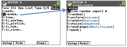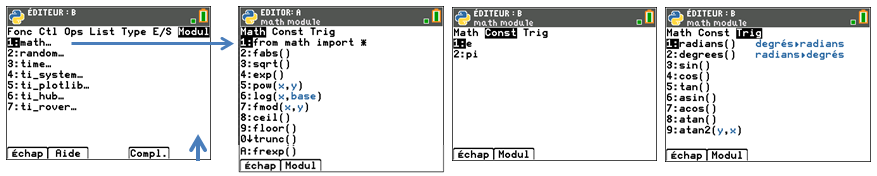 L'onglet de raccourci [Fns…] affiche les menus contenant les fonctions, mots-clés et opérateurs Python fréquemment utilisés. Les menus permettent également d'accéder aux fonctions et constantes sélectionnées dans les modules et modules complémentaires. Même si vous pouvez saisir du code caractère par caractère à partir du clavier, ces menus vous offrent un moyen rapide de coller des données dans l'Éditeur ou le Shell. Appuyez sur [Fns…] dans l'Éditeur ou le Shell. Reportez-vous également aux sections Utilisation du catalogue Python et Utilisation du clavier Python pour d'autres méthodes de saisie.