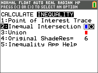 Note: The context help line of the status bar displays INEQUALITY MENU: y /. This menu contains the tools for an inequality intersection and other features. The TI-84 Plus C version displays these tools as shortcut [F1]-[F5] on the graph screen.