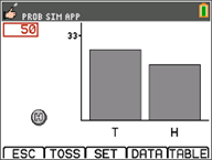 One coin will toss. Now, press +1, +10, or +50 depending on the data you wish to collect. The Frequency Graph updates with each coin toss. Press <ESC> when finished tossing the coins for this simulation. |