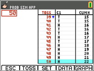 Press TABL to see the value for each toss and the cumulative number of heads for the number of trials. |