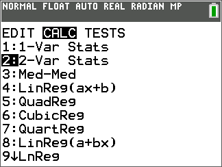 | 3. | Press † until you highlight 2:2-Var Stats, then [enter]. |