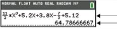 | • | Si la saisie d'une expression dépasse une ligne, elle peut se poursuivre hors de l'écran (dans l'écran de calcul ou l'écran Y=). Appuyez sur ~ pour afficher l'expression complète. |