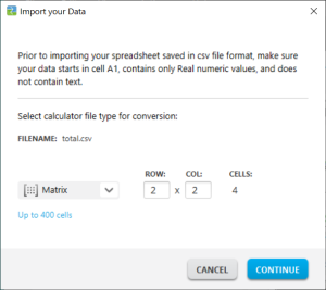 A dimensão da matriz do formulário (linha x coluna) é pedida durante a experiência de importação no Calculator Explorer (Explorador da caculadora). |