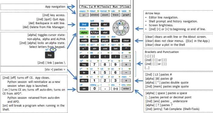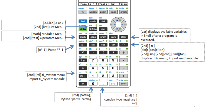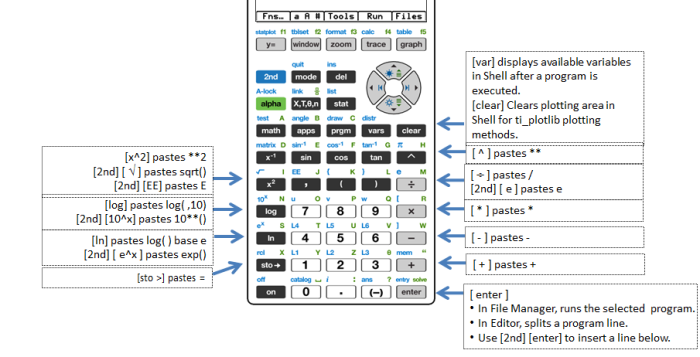When the Python App is running, the keypad is designed to paste the appropriate Python operations or open menus designed for easy entry of functions, keywords, methods, operators, etc. Pressing y and ƒ will access the second and third functions on a key as in the Operating System.