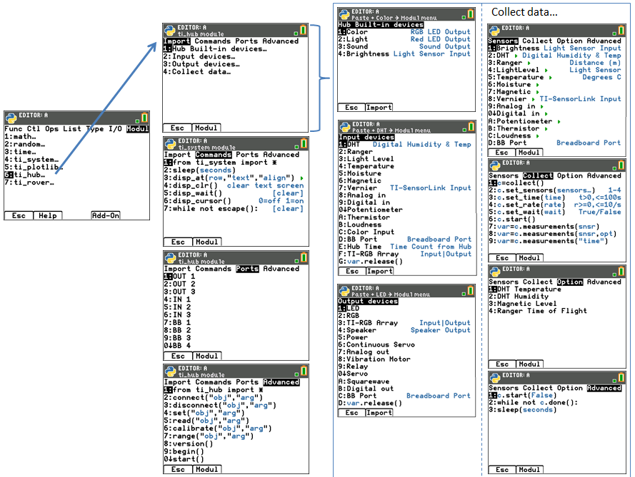 Os métodos ti_hub não estão listados no catálogo e, por isso, não estão listados no guia de referência. Por favor, utilize a informação do ecrã nos menus para detalhes sobre argumentos e predefinições dos argumentos ou valores permitidos. Mais informações sobre programação Python para