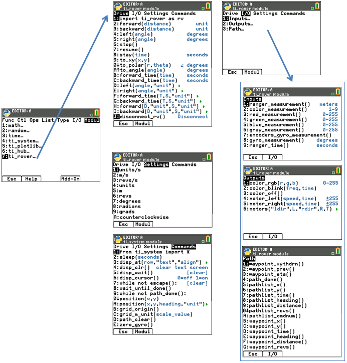 Os métodos ti_rover não estão listados no catálogo e, por isso, não estão listados no guia de referência. Por favor, utilize a informação do ecrã nos menus para detalhes sobre argumentos e predefinições dos argumentos ou valores permitidos. Mais informações sobre programação Python para