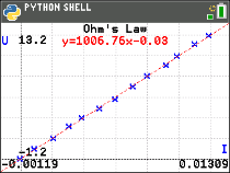 Configure uma equação de regressão antes de executar o programa Python na aplicação Python. Um exemplo seria, em primeiro lugar, introduzir duas listas no SO CE. Depois, por exemplo, calcule [stat] CALC 4:LinReg(ax+b) para as suas listas. Isto guarda a equação de regressão para RegEQ no SO. Aqui está um programa para recuperar RegEQ para a experiência Python.