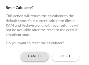 The TI-84 Plus CE online calculator comes loaded with the CE operating system, selected Apps, and 5 pre-loaded Image Vars. No calculator files can be stored to the computer, sent to the online calculator or linked to a connected calculator. Reset Calculator from the Workspace restores the default CE OS, selected Apps and pre-loaded Image Vars. This action will not retain your current work (RAM and Archive) such as lists, matrices, or TI-Basic programs. This feature is not the same as managing the online calculator memory from [2nd] [mem] features in the CE Operating System of the online calculator.