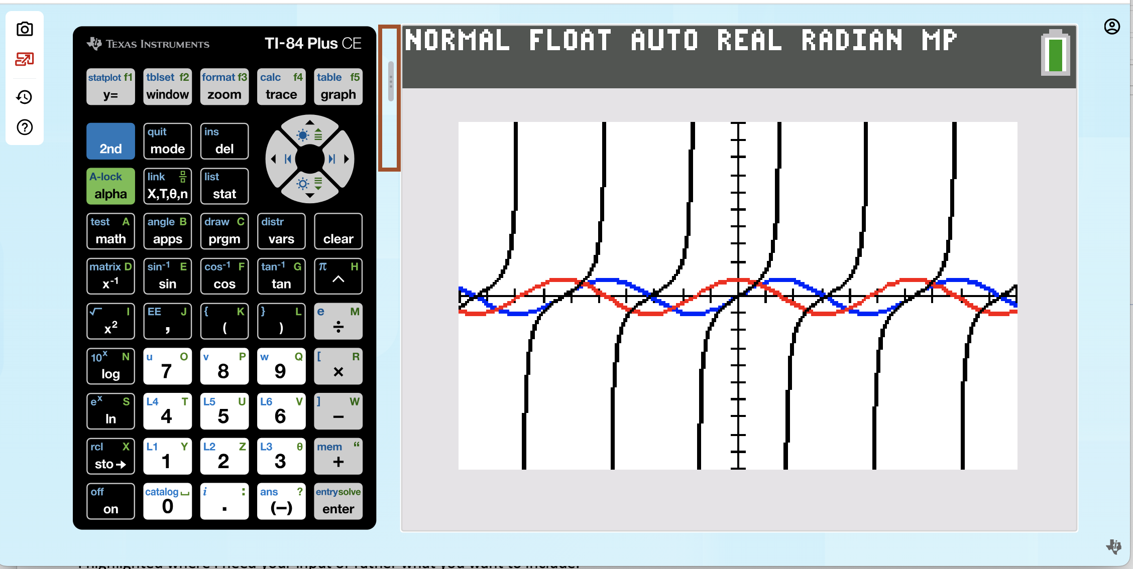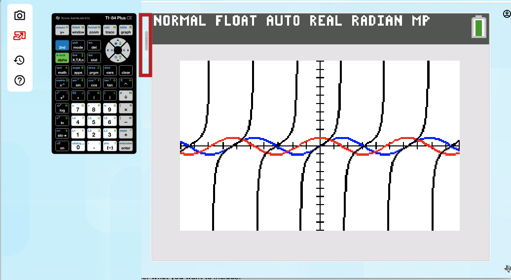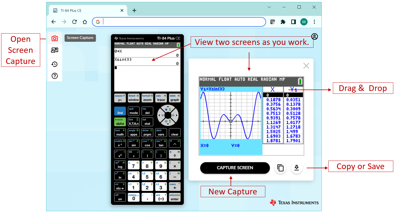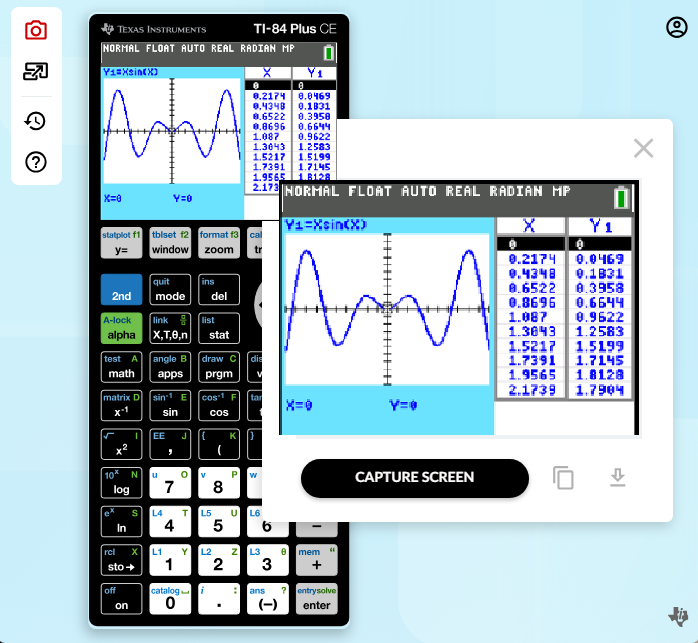 Capture TI-84 Plus CE online calculator screens by selecting the camera icon.