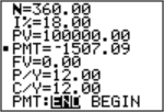 PMT: END BEGIN in the TVM Solver corresponds to the FINANCE CALC menu items Pmt_End (payment at the end of each period) and Pmt_Bgn (payment at the beginning of each period).