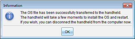 Sobald der Download abgeschlossen ist, wird das Dialogfeld „Information“ mit der Meldung angezeigt, dass das Betriebssystem erfolgreich auf das Lab Cradle übertragen wurde. Sie können die Verbindung zum Lab Cradle trennen. |