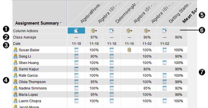 Spaltenüberschrift. Zeigt den Namen der Aufgabe an, die im Arbeitsbereich „Portfolio“ gespeichert wurde. Sie können mit der Spaltenüberschrift ebenso verfahren wie mit den Spaltenaktionen. Klicken Sie mit der rechten Maustaste auf die Spaltenüberschrift, um das Menü zu öffnen. Die Spaltenüberschrift Mittelwert zeigt den Mittelwert für alle Aufgaben und den Mittelwert für alle Aufgaben pro Schüler an. Klicken Sie mit der rechten Maustaste auf die Spalte Mittelwert, um ihn nach auf- oder absteigenden Punktzahlen zu sortieren. |