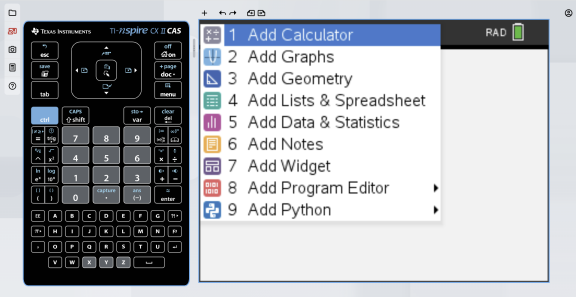 The calculator workspace is displayed with the app menu open.