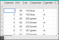 | 1. | Create a list that holds the category identifiers. For this example, name the list “color” and type strings for eye color. Enclose category names in quotes to prevent them from being interpreted as variables. |