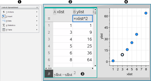 Share columns of data as list variables with other TI-Nspire™ applications. Also share individual cells as variables.