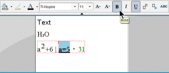 | • | Text in a math expression box. Apply formatting and enter math exponents and math subscripts for variable names. Select font and font size. Font size affects all text in the box. |