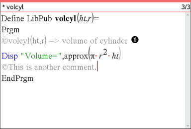 Entre las líneas Func y EndFunc (o Prgm y EndPrgm), escriba las líneas de los enunciados que componen su función o programa. |