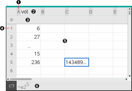 Un tableur comprend une lettre d’identification de colonne en haut de chaque colonne et un numéro de ligne affiché à gauche de chaque ligne. Les deux premières lignes et les numéros de lignes restent affichés pendant le défilement. Vous pouvez nommer une colonne de données de sorte qu’elle soit disponible en tant que variable de type liste dans les applications TI-Nspire™.