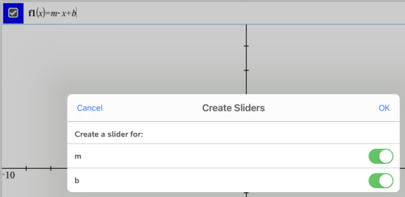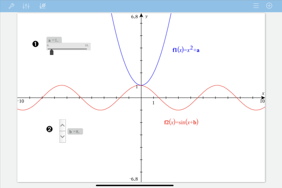 I cursori a scorrimento possono essere creati automaticamente nell’applicazione Grafici e nella finestra analitica dell’applicazione Geometria. Quando vengono definite alcune funzioni, equazioni o successioni che fanno riferimento a variabili non definite sullo schermo appaiono i cursori a scorrimento automatici.