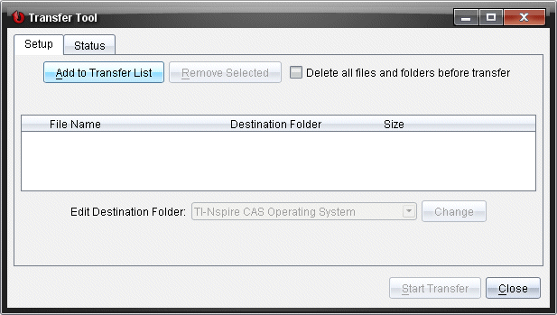Met het tabblad Setup kunt u bestanden selecteren die u wilt overzenden en kunt u een doelmap selecteren.