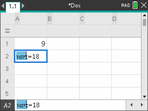 U kunt de waarde van een bestaande variabele controleren door de naam ervan in te voeren op de invoerregel van de Rekenmachine. Wanneer u de naam van een opgeslagen variabele typt, verschijnt deze vetgedrukt.
