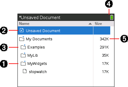 SkjermenMine dokumenter åpnes, og alle mappene og filene på grafregneren vises.