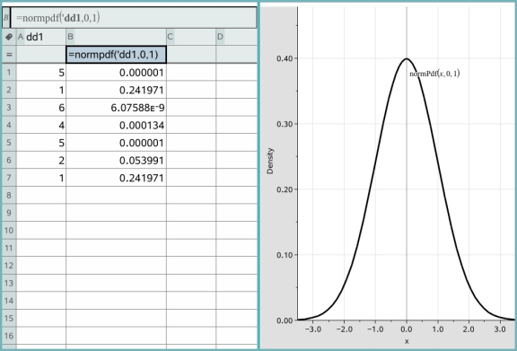 Nota: Para funções de distribuição que suportem a opção de desenho (normPDF, t PDF, χ² Pdf, e F Pdf), a opção só está disponível se introduzir a função de distribuição numa célula da fórmula.