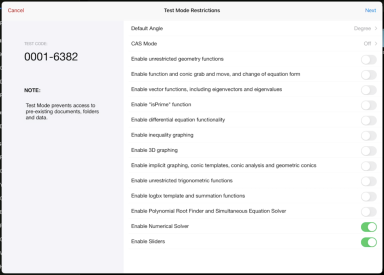 En grøn titellinje angiver, at softwaren er i testtilstand. Den viser ikonet Afslut, ikonet Fortryd/Annuller fortryd, ikonet Ryd dokument, status for CAS- eller Eksakt aritmetik-tilstandsstatus (når det er relevant), Testkode, den tid, der er gået i Testsessionen, ikonet Information om testtilstand og ikonet Indstillinger. |