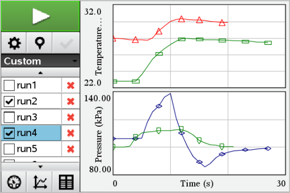 den indsamlede data med data fra næste kørsel. For at bevare hver kørsel, skal du lagre det som et datasæt. Efter lagring af flere datasæt, kan du lægge enhver kombination af disse ind i Vis graf.