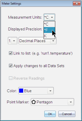 Måleenheder afhænger af den valgte sensor. Mulige indstillinger for temperatursensoren Vernier Go!Temp® er for eksempel fahrenheit, celsius og kelvin. Mulige indstillinger for Verniers Håndtryksdynamometer (en specialiseret kraftsensor) er newton, pund og kilogram.