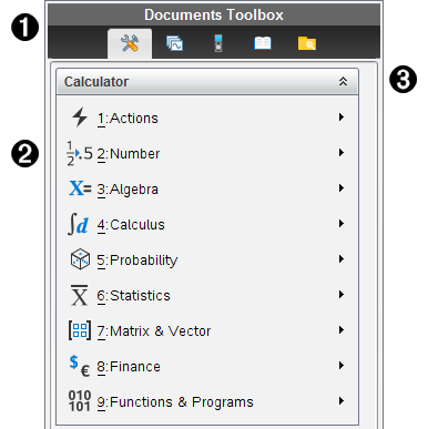 I følgende eksempel er menuen Dokumentfunktioner åben og viser indstillingerne for Beregninger-applikationen. I TI-Nspire™-dokumenter indeholder menuen Dokumentfunktioner de værktøjer, der er tilgængelige til arbejdet med en applikation. Værktøjerne er specifikke for den aktive applikation.