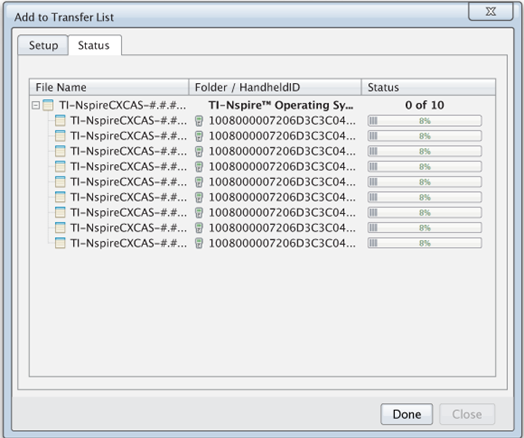 De tilsvarende styresystem filer overføres til de tilsluttede enheder. Du kan opdatere håndholdte TI-Nspire™ CX-enheder og håndholdte TI-Nspire™ CX II-enheder samtidig. Hvis du ikke kan tilslutte alle håndholdte på samme tid skal du tilslutte så mange som muligt, og opdatere OS. Når OS-opdateringen er fuldført, skal du frakoble de håndholdte og gentage OS-opdateringen, indtil alle håndholdte er blevet opdateret. Softwaren detekterer det OS, som der er brug for, og starter overførslen når du tilslutter de håndholdte.