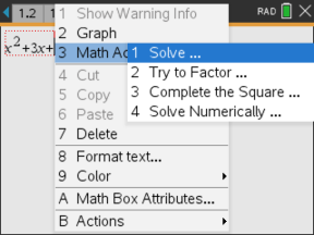 | 2. | Vis ligningens kontekstmenu, og vælg Matematikhandlinger. Windows®: Højreklik på ligningen. Mac®: Hold " nede, og klik på ligningen. Håndholdt: Peg på ligningen, og tryk på / b. |