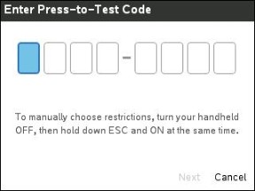 Bemærk: Dette gælder kun for TI-Nspire™ CX II håndholdte enheder. Du kan få en testkode ved hjælp af metoden Vælg begrænsninger eller ved at klargøre den håndholdte enhed i TI-Nspire™ Premium Teacher-softwaren (se afsnittet Klargøring af håndholdte enheder via fjernadgang i den vejledning).