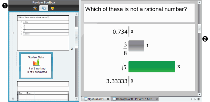 Vinduet datavisning. Viser dataene og valgmuligheder fra den rundspørge eller det dokument, du har valgt i værktøjskassen bedømmelse. Du kan i datavisning skifte mellem søjlediagram, tabel og graf (hvis det er tilgængeligt). Softwaren beholder datavisningen, der var indstillet for hvert spørgsmål, da du lukkede og genåbnede bedømmelsesarbejdsområdet. Alle skjulte og ikke-skjulte data, indstillinger i grafvisning, visning af søjlediagram og Vis dit arbejde beholdes når du lukker bedømmelsesarbejdsområdet. |