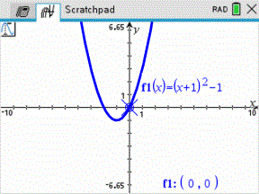 Hvis det angivne søgeinterval indeholder punktet af interesse, vises en etikette for punktet. Hvis du ændrer en graf med identificerede punkter af interesse, skal du holde øje med ændringer i punkterne af interesse. Hvis du for eksempel redigerer funktionen i indtastningslinjen eller manipulerer et plot, kan punktet, hvor grafen skærer x-aksen, ændre sig.