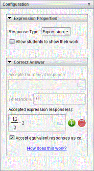 Åbn konfigurationsværktøjet for at indstille svartypen til Tal eller Udtryk, indstille hvorvidt eleverne skal vise deres mellemregninger og indtaste et korrekt svar. Du kan også indstille tolerancen for Taltyperne eller tilsvarende svar for Udtrykstyper. |