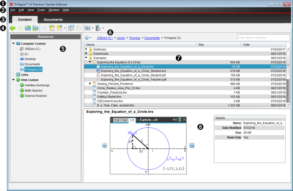 Indholdsfelt. Viser indholdet for den valgte resource. Du kan bruge indholdsfeltet som filstyring til at finde og få vist mapper, lektionspakker og TI-Nspire™-dokumenter på computeren eller på tilsluttede håndholdte. Klik på |