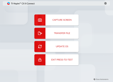La page d'accueil s'ouvre et affiche les quatre options disponibles : Capture Screen, Transfer File, Update OS et Exit Press-to-Test.