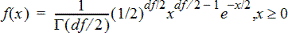 Calcule la fonction de densité de probabilité (DdP) pour la distribution c2 (chi-deux) à une valeur x spécifiée. df (degrés de liberté) doit être un entier > 0. La fonction de densité de probabilité (DdP) est :