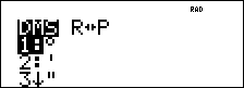 % I affiche deux sous-menus qui permettent de spécifier le modificateur d'unité d'angle, à savoir degrés (º), minutes ('), secondes ("), radians (r), grades (g), ou de convertir les unités à l'aide de 4DMS. Vous pouvez également convertir des coordonnées rectangulaires (R) en coordonnées polaires (P) et inversement. (Pour plus d'informations, voir Conversion du format rectangulaire en format polaire.)