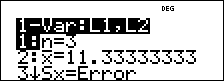 Remarque : Les éléments de fréquence non entiers sont valables. Ceci est pratique pour la saisie de fréquences exprimées sous forme de pourcentages ou de valeurs qui, une fois additionnées, sont égales à 1. Cependant, l'écart type d'échantillon, Sx, n'est pas défini pour les fréquences non entières, et le message Sx = Error s'affiche en regard de cette valeur. Toutes les autres statistiques sont affichées.