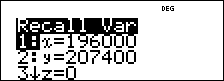 % h rappelle les valeurs des variables. Appuyez sur % h pour afficher un menu de variables et les valeurs stockées associées. Sélectionnez la variable à rappeler, puis appuyez sur <. La valeur assignée à la variable est insérée dans l'entrée active et est utilisée pour évaluer l'expression.
