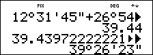 Deux angles adjacents mesurent 12Ä 31Å 45Æ et 26Ä 54Å 38 Æ respectivement. Additionnez les mesures de ces deux angles et affichez le résultat au format DMS. Arrondissez le résultat à deux décimales.